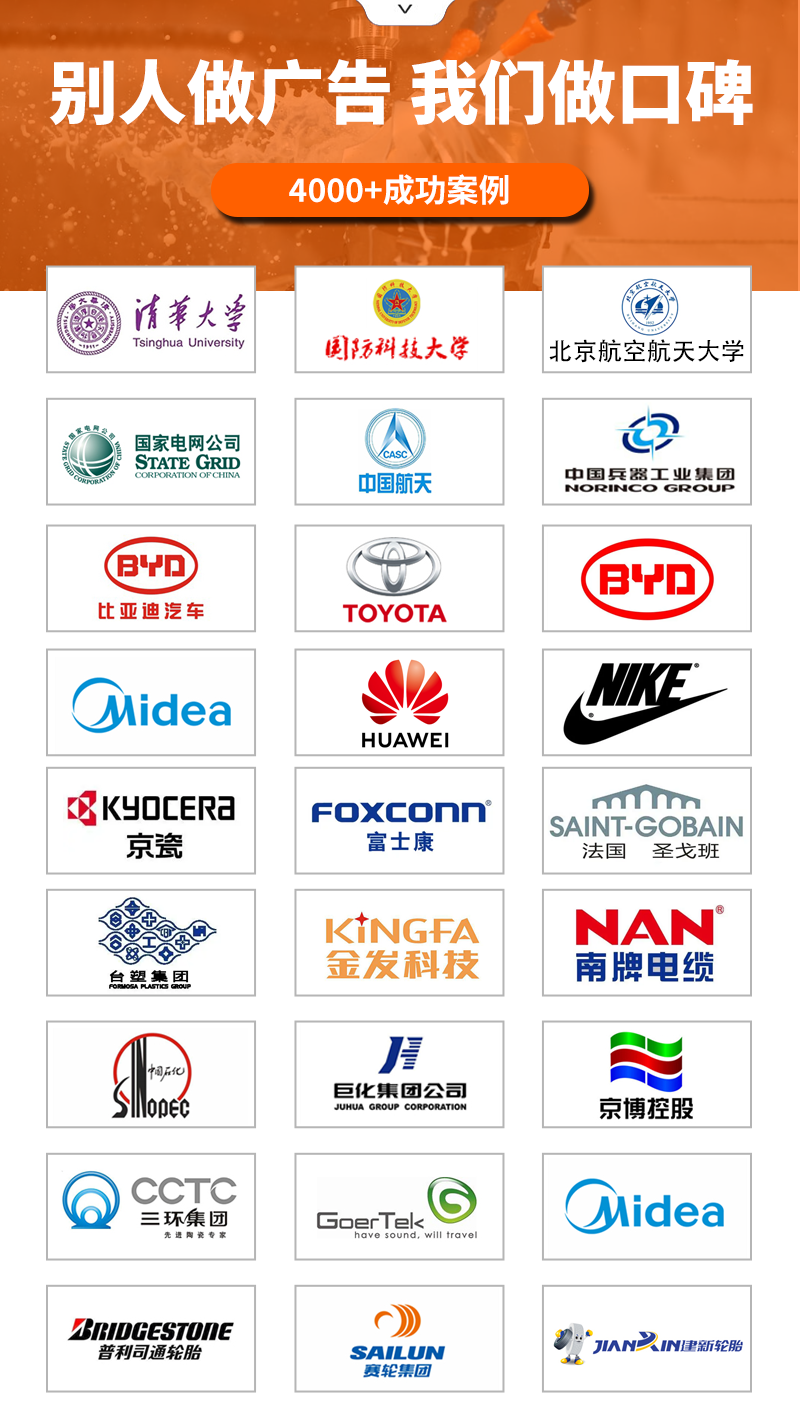 多年來公司已成功服務國內(nèi)外眾多中高端客戶,如:京瓷、比亞迪、美的、金發(fā)科技、歌爾聲學、潮州三環(huán)、中國科學院、清華大學、上海大學、國防科技大學、華南理工等企業(yè),利拿為他們提供了值得信賴的設備與服務,建立了良好的合作關系。